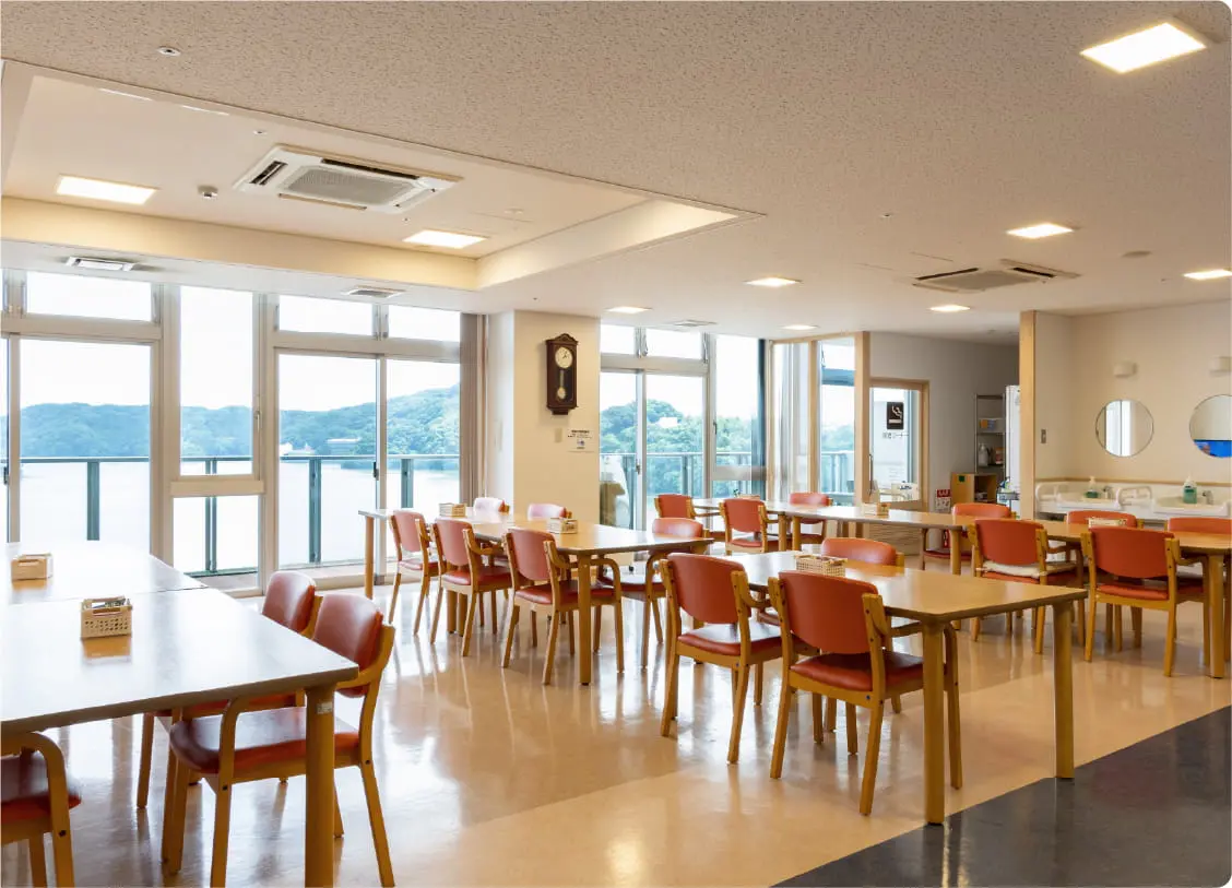 コミュニケーションリビングは、食事やレクリエーション、イベントなどで使用される共用空間。窓いっぱいに広がる景色と差し込む陽光が、集いの時間に彩りを添えます。