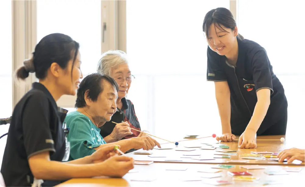 笑顔とつながりを。「楽しみに来たよ」と言っていただけるような、笑顔あふれるデイサービスを目指しています。機能訓練やレクリエーションを通して、無理なく、楽しく、心と体を動かせるよう工夫しています。1日の流れにはラジオ体操や入浴、個別機能訓練(理学療法士が担当)などを組み込み、午後からは脳トレや手作業、選択制のレクリエーションで自由に過ごしていただけます。ご家族にとっても安心できる「第2の居場所」としてご利用いただいています。